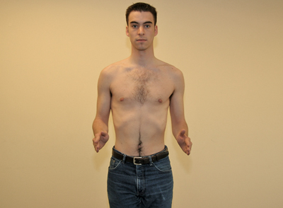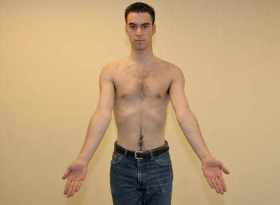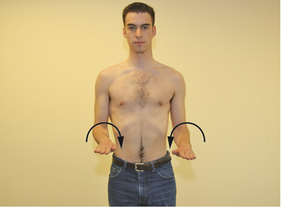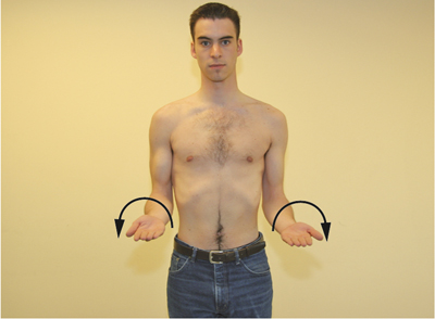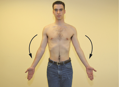 • The patient stands or sits comfortably with arms hanging down, and facing the examiner.