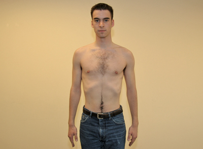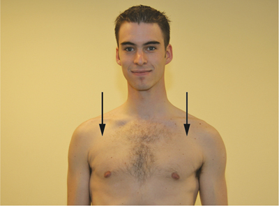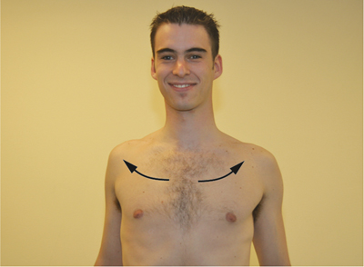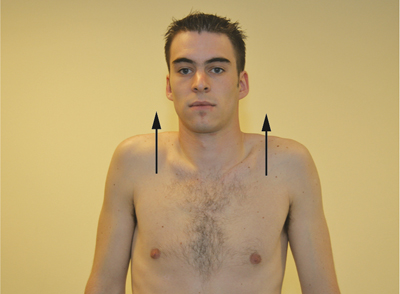- The patient should stand or sit comfortably with their arms hanging down, and face the examiner.