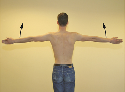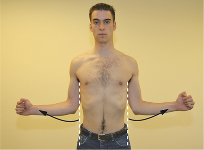The baseline position is a position where the arm is alongside the torso with the thumb pointed ventrally. Range of movement is assessed using this position as a reference [Figure 17]. The active movement of both shoulders should be carried out by the patient as simultaneously and symmetrically as possible, to avoid movement of the torso and to allow comparison of the side that is being examined with the contralateral side. If necessary, demonstrate the movements.