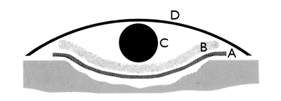 This is a variant of the wound dressing [Figure 2]. It is used for external wounds with arterial or venous bleeding. An object the size of the wound (C) is placed on top of the layer in contact with the wound (A) and the absorbent layer (B). The dressing material is fixed using a roller bandage (D) and the object (C) is pressed against the wound. By applying pressure in this way, bleeding is more likely to stop. The application is described in “The Wound Compression Bandage.”