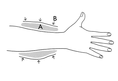 This bandaging is used for internal wounds to prevent or limit swelling as the result of bleeding [Figure 3]. By tightly applying a roller bandage (B) around the body part involved, circular pressure is exerted. To ensure that the pressure is evenly distributed, a pressure-distributing layer (A) is placed between the skin and the bandage (B). The application is described in “The Compression Bandage.”