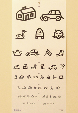 From the age of 2 to 3 years, the Amsterdam Picture Chart-TOV or the LEA-symbols can be used, either grouped in the Hyvärinen chart or applied as individual symbols (less reliable). Most modern visual acuity charts for children are standardised for a distance of 3 m. Ensure that the chart is placed at child’s height. This chart needs to be illuminated with a light intensity of 100 lux.