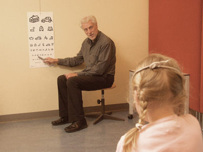 - Allow the child to stand at the distance indicated on the chart. They may stand up or sit down. Depending on this, the chart should be at the correct height. If the child does not want to sit on the chair alone, they are allowed to sit on their guardian’s lap. Ensure that the chair is moved backwards in order to allow the child to sit at the required distance.