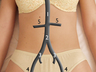 • Listen above all of the major vessels [Figure 47]. If the abdominal pain depends on a certain position, also listen while the patient is in this position.