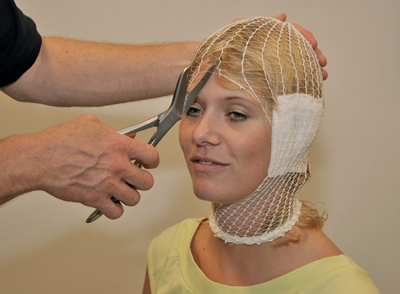 - Use the bandage scissors to cut away a hole for the face [Figure 76].