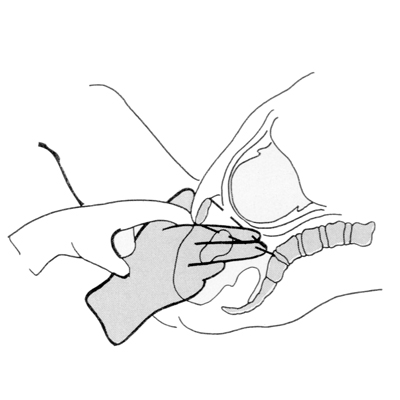 - Place the radial side of the index finger against the lower edge of the symphysis.