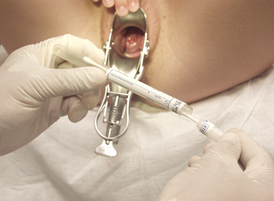 - Using a cotton bud, remove some discharge from the external os and rinse this in the medium for PCR analysis (this is often a complete sampling kit).
