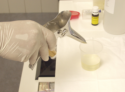 Oil is transparent and fairly sticky [Figure 10]. It rarely causes irritation and performs quite well as a lubricant. You apply sweet oil by dipping the tip of the speculum in it, allowing excess oil to drip off. This method of application and the fact the sweet oil is stored in an open container, makes it less hygienic. The latter can be counteracted by regularly replacing the content of the container. It is possible that sweet oil may also influence a culture and/or a smear.