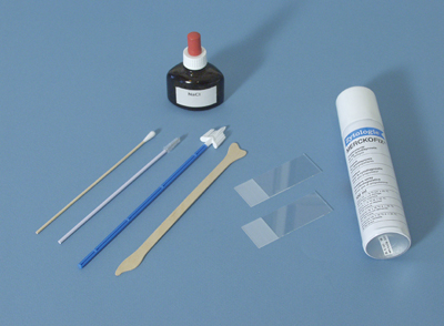- Cotton bud (with bottle of NaCl 0.9% aqueous solution) or cytobrush with gynaecological smear spatula, or Cervix-brush® [Figure 13].