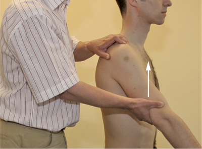 • Place one hand on the shoulder involved; the acromioclavicular joint should, preferably, be palpated using the fingertips.