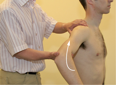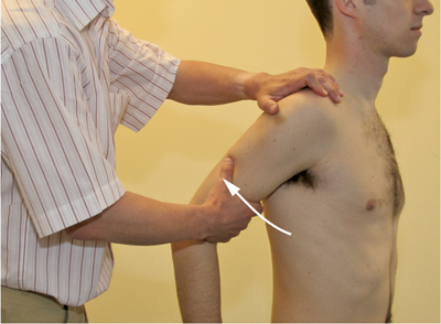 • With the other hand, the upper arm should be grasped distally (except in the case of outward and inward rotation). It is essential here that one of the examiner’s hands is fixed and that the other hand carries out the movement.