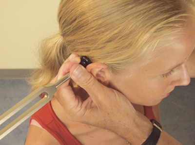- Ask the patient whether they can hear the humming of the tuning fork more loudly when the tuning fork is behind the ear, against the mastoid process, or in front of the ear.
