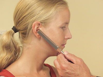 - Make sure that you hold the tuning fork so that both legs are vibrating in front of the external auditory meatus (imagine that the legs are covered by a stick and hold the middle of the tip of this imaginary stick in front of the auditory meatus) [Figure 18].