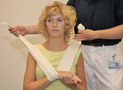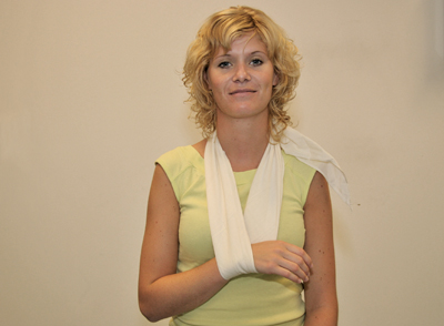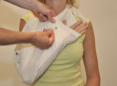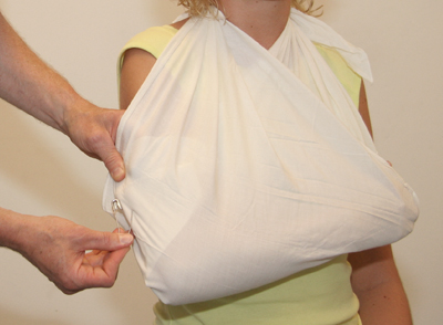 • Fold the cloth around the wrist joint and place this tail over the injured shoulder.