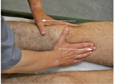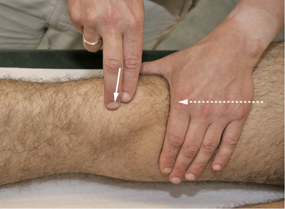 - With a sweeping movement using the entire hand, the examiner should fully empty the suprapatellar recess by stroking in the distal direction.