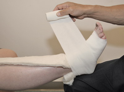 - Now apply spiral turns towards the knee. Make sure that each turn covers 2/3 of the previous turn and that the pressure decreases in a distal to proximal direction.