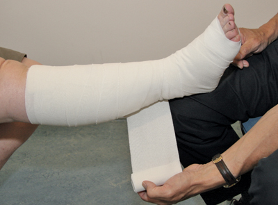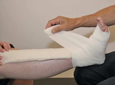 Muscle pump function can be improved by encouraging the patient to carry out exercises and by applying a pressure gradient bandage. By applying a non-elastic or only slightly elastic roller bandage around the lower leg, the superficial and perforant veins are pressed shut and tissue pressure is increased. This stimulates venous return towards the heart. When the calf muscles are being used (i.e., when walking, moving) the active pressure is high, when lying down the rest pressure is low. For this reason it is notnecessary to remove the bandage at night. For the first two weeks, the compression bandage should be replaced twice a week, and thereafter once a week (at the same time as the ulcer dressing is replaced). The lower leg should be bandaged from the proximal side of the toes up to the knee. The pressure should decrease in a distal to proximal direction (hence the name pressure gradient bandage).