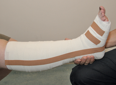 - Fix the bandages by applying leukoplast along the length of the lower leg and under the sole of the foot to create a ‘stirrup’ [Figure 145].