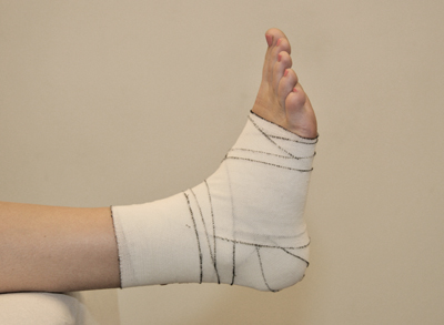 - Apply the fourth turn, returning from the Achilles tendon and lateral part of the ankle, in a circular movement around the forefoot [Figures 93, 94].