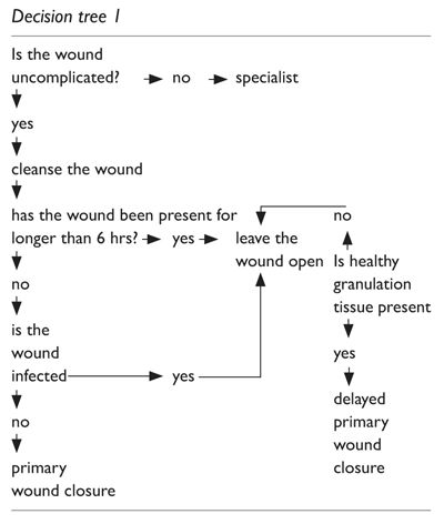 Before treating the wound, a decision must be made about whether treatment will be performed by yourself or a specialist. History-taking and examination can help make the right decision. Decision Tree 1 illustrates the steps involved in the decision-making process.