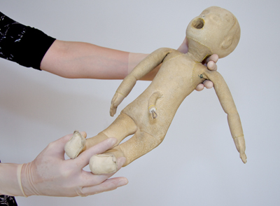• Hold the ankles of the baby in one hand in a fork grip [Figure 33a].
