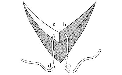 - For V- or T-shaped wounds, intracutaneous three-point stitches are made (a stitch directly through the skin flap can lead to necrosis).